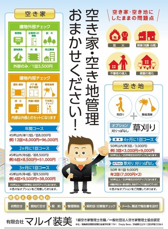 マルイ装美の空き家管理・空き地管理はローコストで安心できるサービスです。